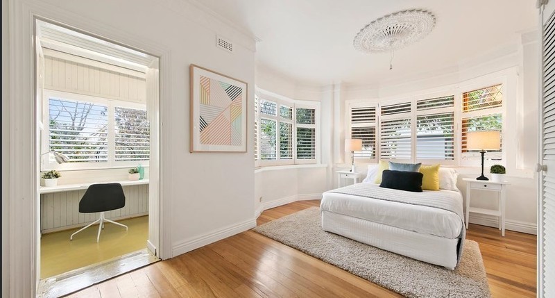 2 bedrooms — main with BIR’s and adjoining study overlooking Darling Gardens.